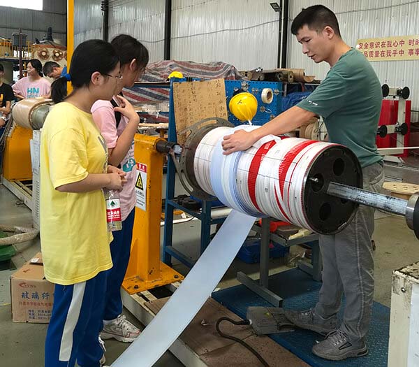 在繞線區(qū),同學(xué)們饒有興趣地向變壓器師傅們學(xué)習(xí)變壓器線圈的繞制并提出各種問題,指導(dǎo)老師也非常耐心地解答同學(xué)們的提問。