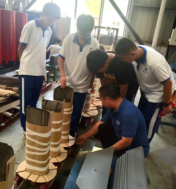 經(jīng)過簡(jiǎn)短的安全培訓(xùn)后,帶領(lǐng)同學(xué)們進(jìn)入車間,依照變壓器生產(chǎn)中的繞線、澆注與浸漆、組裝和測(cè)試等工藝流程開始參觀學(xué)習(xí)。